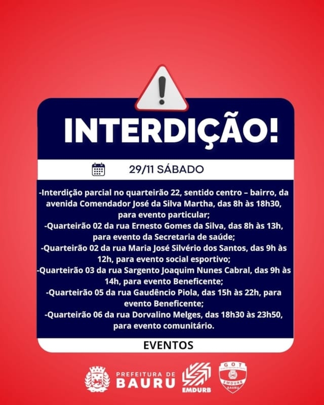 A Diretoria de Sistema Viário e Transportes da EMDURB, por meio do GOT, informa as seguintes interdições:SÁBADO (29):-Interdição parcial no quarteirão 22, sentido centro – bairro, da avenida Comendador José da Silva Martha, das 8h às 18h30, para evento particular;-Quarteirão 02 da rua Ernesto Gomes da Silva, das 8h às 13h, para evento da Secretaria de saúde;-Quarteirão 02 da rua Maria José Silvério dos Santos, das 9h às 12h, para evento social esportivo;-Quarteirão 03 da rua Sargento Joaquim Nunes Cabral, das 9h às 14h, para evento Beneficente;-Quarteirão 05 da rua Gaudêncio Piola, das 15h às 22h, para evento Beneficente;-Quarteirão 06 da rua Dorvalino Melges, das 18h30 às 23h50, para evento comunitário.DOMINGO (30):-Cruzamento da rua Batista de Carvalho com Treze de Maio e Agenor Meira, a partir das 7h30, para pintura de faixas de pedestres.SEGUNDA-FEIRA (01):-Cruzamento da rua Batista de Carvalho com Azarias Leite e Rio Branco, a partir das 7h30, para pintura de faixas de pedestres;-Cruzamento da rua Batista de Carvalho com Virgílio Malta e Gustavo Maciel, a partir das 13h30, para pintura de faixas de pedestres. Os locais estarão sinalizados pelo GOT – Grupo de Operações de Trânsito. A EMDURB pede atenção aos motoristas.Acesse o link e participe da comunidade GOT e receba as interdições.https://chat.whatsapp.com/H9DZAyZCfXf3ata4FZ2gyqComunicação – EMDURB