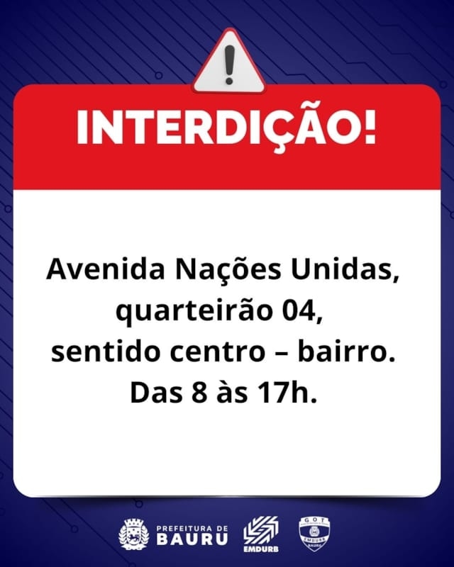 A Diretoria de Sistema Viário e Transportes da EMDURB, por meio do GOT, informa que o quarteirão 04 da avenida Nações Unidas, sentido centro – bairro, estará interditado para obras (sob o viaduto da linha férrea). Haverá compartilhamento de fluxo no sentido bairro – centro. A interdição será até as 17h. O local será sinalizado pelo GOT – Grupo de Operações de Trânsito. A EMDURB pede atenção aos motoristas.Comunicação – EMDURB