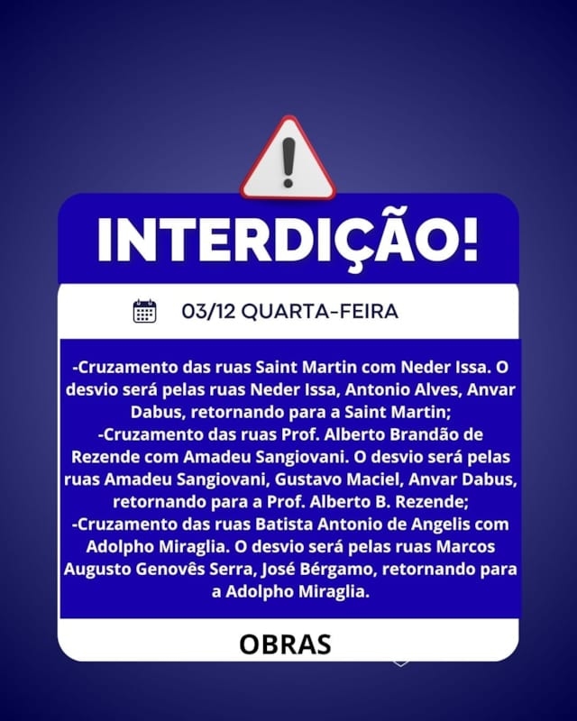 -Cruzamento das ruas Saint Martin com Neder Issa. O desvio será pelas ruas Neder Issa, Antonio Alves, Anvar Dabus, retornando para a Saint Martin;