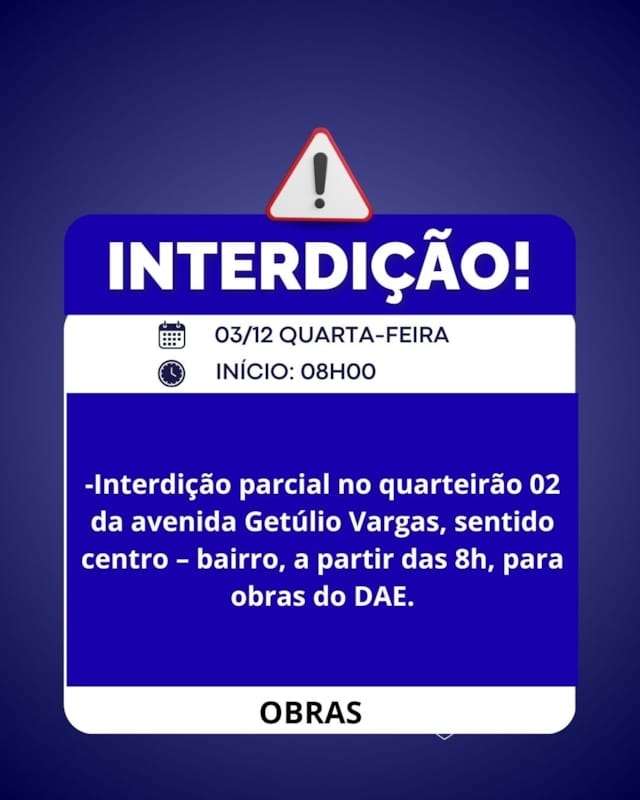-Interdição parcial no quarteirão 02 da avenida Getúlio Vargas, sentido centro – bairro), a partir das 8h, para obras do DAE;