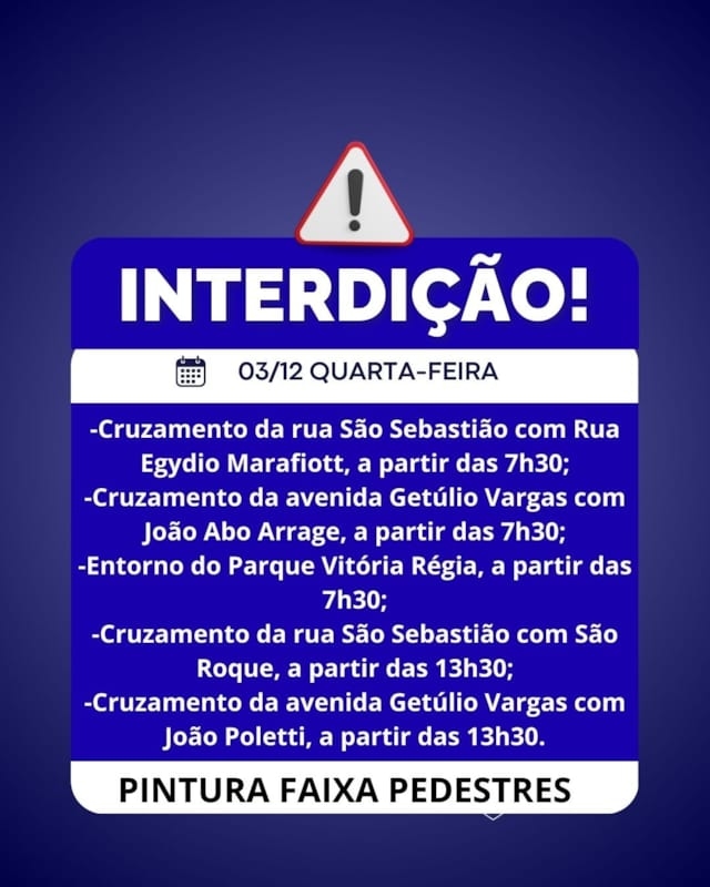 A Diretoria de Sistema Viário e Transportes da EMDURB, por meio do GOT, informa as seguintes interdições:Interdições para obras de reconstrução de canaletas, a partir das 8h:-Cruzamento das ruas Saint Martin com Neder Issa. O desvio será pelas ruas Neder Issa, Antonio Alves, Anvar Dabus, retornando para a Saint Martin;-Cruzamento das ruas Prof. Alberto Brandão de Rezende com Amadeu Sangiovani. O desvio será pelas ruas Amadeu Sangiovani, Gustavo Maciel, Anvar Dabus, retornando para a Prof. Alberto B. Rezende;-Cruzamento das ruas Batista Antonio de Angelis com Adolpho Miraglia. O desvio será pelas ruas Marcos Augusto Genovês Serra, José Bérgamo, retornando para a Adolpho Miraglia.Interdições para pintura de faixas de pedestres:-Cruzamento da rua São Sebastião com Rua Egydio Marafiott, a partir das 7h30;-Cruzamento da avenida Getúlio Vargas com João Abo Arrage, a partir das 7h30;-Entorno do Parque Vitória Régia, a partir das 7h30;-Cruzamento da rua São Sebastião com São Roque, a partir das 13h30;-Cruzamento da avenida Getúlio Vargas com João Poletti, a partir das 13h30.Demais interdições:-Interdição parcial no quarteirão 02 da avenida Getúlio Vargas, sentido centro – bairro), a partir das 8h, para obras do DAE;-Quarteirão 06 da Praça Antônio José Miziara cruzamento com a rua Antônio Garcia, das 14h às 22h30, para evento Luzes no Vitória. Os locais estarão sinalizados pelo GOT – Grupo de Operações de Trânsito. A EMDURB pede atenção aos motoristas.Acesse o link e participe da comunidade GOT e receba as interdições.https://chat.whatsapp.com/H9DZAyZCfXf3ata4FZ2gyqComunicação – EMDURB