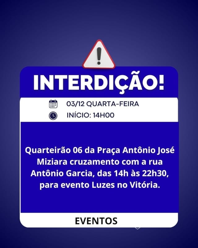 -Quarteirão 06 da Praça Antônio José Miziara cruzamento com a rua Antônio Garcia, das 14h às 22h30, para evento Luzes no Vitória.