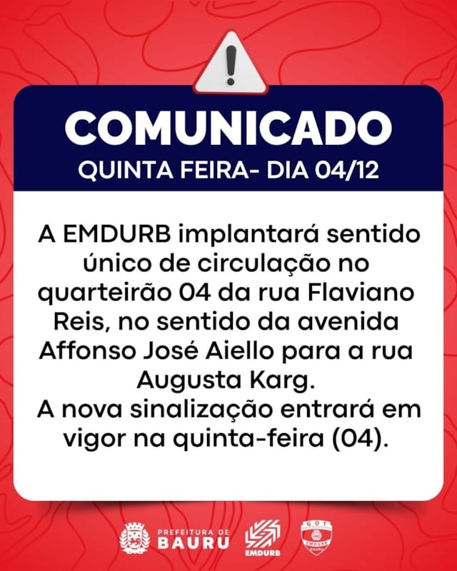 A EMDURB implantará sentido único de circulação no quarteirão 04 da rua Flaviano Reis, no sentido da avenida Affonso José Aiello para a rua Augusta Karg. A nova sinalização entrará em vigor na quinta-feira (04).