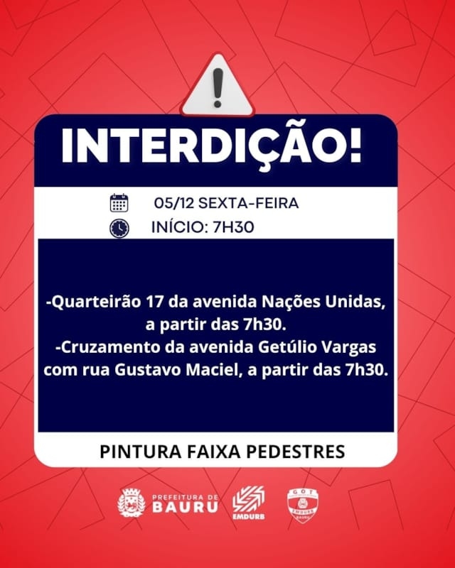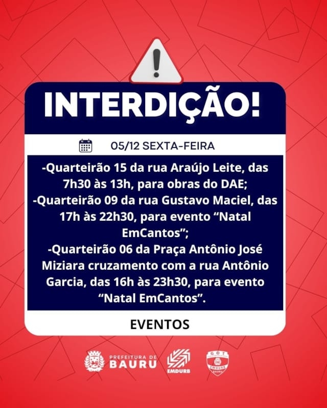 A Diretoria de Sistema Viário e Transportes da EMDURB, por meio do GOT, informa as seguintes interdições:-Quarteirão 15 da rua Araújo Leite, das 7h30 às 13h, para obras do DAE;-Quarteirão 17 da avenida Nações Unidas, a partir das 7h30, para pintura de faixas de pedestres;-Cruzamento da avenida Getúlio Vargas com rua Gustavo Maciel, a partir das 7h30, para pintura de faixas de pedestres;-Quarteirão 06 da rua Abrahão Rahal, a partir das 8h, para serviço de reconstrução e nivelamento de canaletas de drenagem. O desvio será pela rua Saint Martin, Júlio de Mesquita Filho, Araújo Leite, retornando para a Abrahão Rahal;-Quarteirão 01 da rua Alípio dos Santos, a partir das 8h, para serviço de reconstrução e nivelamento de canaletas de drenagem. O desvio será pela rua Cláudio Zuicker, avenida Octávio Pinheiro Brisola, retornando para a Alípio dos Santos;-Quarteirão 06 da Praça Antônio José Miziara cruzamento com a rua Antônio Garcia, das 16h às 23h30, para evento “Natal EmCantos”;-Quarteirão 09 da rua Gustavo Maciel, das 17h às 22h30, para evento “Natal EmCantos”. Os locais estarão sinalizados pelo GOT – Grupo de Operações de Trânsito. A EMDURB pede atenção aos motoristas.Acesse o link e participe da comunidade GOT e receba as interdições.https://chat.whatsapp.com/H9DZAyZCfXf3ata4FZ2gyqComunicação – EMDURB