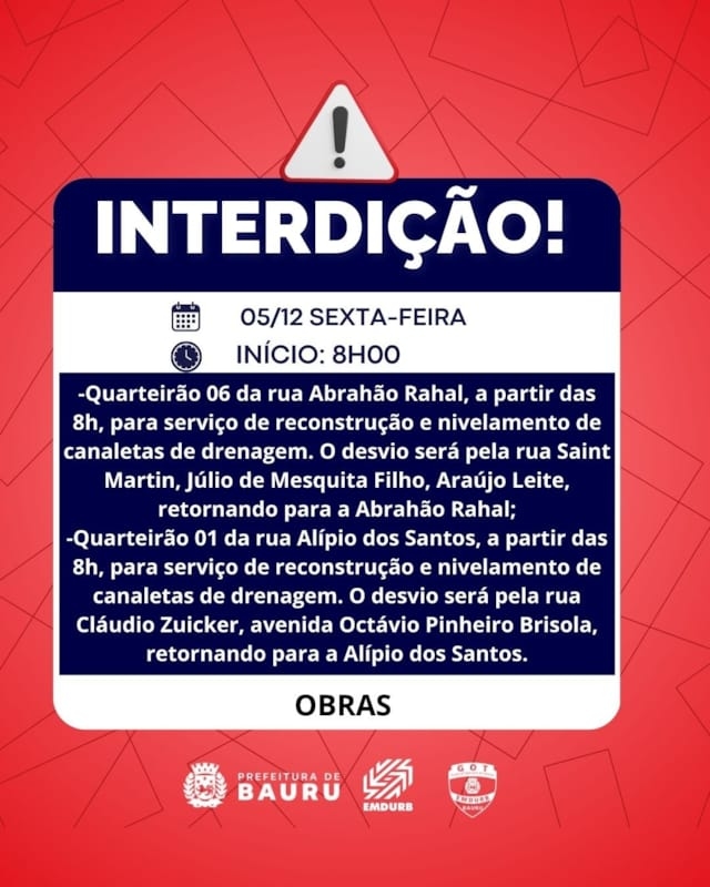 -Quarteirão 01 da rua Alípio dos Santos, a partir das 8h, para serviço de reconstrução e nivelamento de canaletas de drenagem. O desvio será pela rua Cláudio Zuicker, avenida Octávio Pinheiro Brisola, retornando para a Alípio dos Santos;