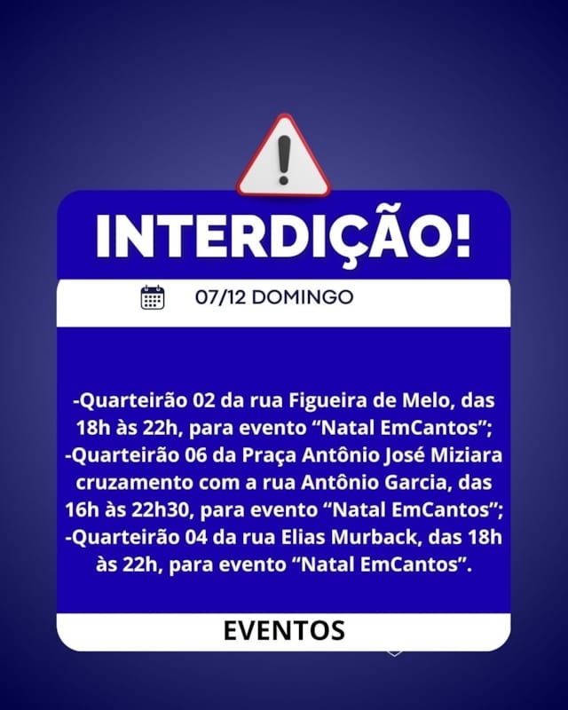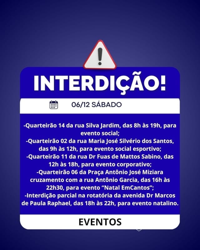 A Diretoria de Sistema Viário e Transportes da EMDURB, por meio do GOT, informa as seguintes interdições:SÁBADO (06):-Quarteirão 14 da rua Silva Jardim, das 8h às 19h, para evento social;-Quarteirão 02 da rua Maria José Silvério dos Santos, das 9h às 12h, para evento social esportivo;-Quarteirão 11 da rua Dr Fuas de Mattos Sabino, das 12h às 18h, para evento corporativo;-Quarteirão 06 da Praça Antônio José Miziara cruzamento com a rua Antônio Garcia, das 16h às 22h30, para evento “Natal EmCantos”;-Interdição parcial na rotatória da avenida Dr Marcos de Paula Raphael, das 18h às 22h, para evento natalino.DOMINGO (07):-Quarteirão 02 da rua Figueira de Melo, das 18h às 22h, para evento “Natal EmCantos”;-Quarteirão 06 da Praça Antônio José Miziara cruzamento com a rua Antônio Garcia, das 16h às 22h30, para evento “Natal EmCantos”;-Quarteirão 04 da rua Elias Murback, das 18h às 22h, para evento “Natal EmCantos”.Corrida de rua “VOE RUNNING”: No domingo haverá a realização da corrida de rua “VOE Running”, com saída do quarteirão 12 da rua Gustavo Maciel. Para tanto, a partir das 6h, algumas vias estarão interditadas parcialmente: quarteirão 12 da rua Gustavo Maciel, quarteirões 01 ao 04 da rua Constituição, quarteirões 14 ao 50 da avenida Nações Unidas.SEGUNDA-FEIRA (08):-Quarteirão 04 da rua Vangélio Mondelli, das 7h às 12h, para içamento de carga;-Cruzamento da avenida Nações Unidas com rua Capitão João Antônio, a partir das 7h30, para pintura de faixas de pedestres;-Cruzamento da avenida Getúlio Vargas com ruas Sebastião Lins e Alfredo Fontão, a partir das 7h30, para pintura de faixas de pedestres;-Cruzamento da avenida Getúlio Vargas com rua Neder Issa, a partir das 13h30, para pintura de faixas de pedestres;-Cruzamento da avenida Nações Unidas com Rodrigo Romeiro, a partir das 13h30, para pintura de faixas de pedestres. Os locais estarão sinalizados pelo GOT – Grupo de Operações de Trânsito. A EMDURB pede atenção aos motoristas.Acesse o link e participe da comunidade GOT e receba as interdições.https://chat.whatsapp.com/H9DZAyZCfXf3ata4FZ2gyqComunicação – EMDURB