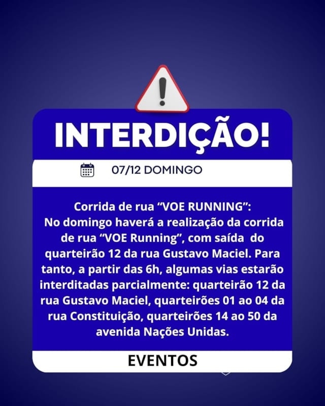 No domingo haverá a realização da corrida de rua “VOE Running”, com saída do quarteirão 12 da rua Gustavo Maciel. Para tanto, a partir das 6h, algumas vias estarão interditadas parcialmente: quarteirão 12 da rua Gustavo Maciel, quarteirões 01 ao 04 da rua Constituição, quarteirões 14 ao 50 da avenida Nações Unidas.
