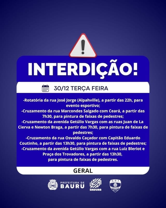 A Diretoria de Sistema Viário e Transportes da EMDURB, por meio do GOT, informa as seguintes interdições:-Rotatória da rua José Jorge (Alphaville), a partir das 22h, para evento esportivo;-Cruzamento da rua Marcondes Salgado com Ceará, a partir das 7h30, para pintura de faixas de pedestres;-Cruzamento da avenida Getúlio Vargas com as ruas Juan de La Cierva e Newton Braga, a partir das 7h30, para pintura de faixas de pedestres;-Cruzamento da rua Osvaldo Caçador com Capitão Eduardo Coutinho, a partir das 13h30, para pintura de faixas de pedestres;-Cruzamento da avenida Getúlio Vargas com a rua Luiz Bleriot e Praça dos Trovadores, a partir das 13h30, para pintura de faixas de pedestres. Os locais estarão sinalizados pelo GOT – Grupo de Operações de Trânsito. A EMDURB pede atenção aos motoristas.Acesse o link e participe da comunidade GOT e receba as interdições.https://chat.whatsapp.com/H9DZAyZCfXf3ata4FZ2gyqComunicação – EMDURB