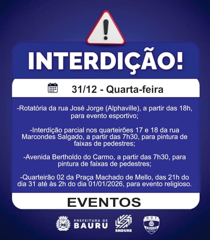 A Diretoria de Sistema Viário e Transportes da EMDURB, por meio do GOT, informa as seguintes interdições:-Rotatória da rua José Jorge (Alphaville), a partir das 18h, para evento esportivo;-Interdição parcial nos quarteirões 17 e 18 da rua Marcondes Salgado, a partir das 7h30, para pintura de faixas de pedestres;-Avenida Bertholdo do Carmo, a partir das 7h30, para pintura de faixas de pedestres;-Quarteirão 02 da Praça Machado de Mello, das 21h do dia 31 até às 2h do dia 01/01/2026, para evento religioso. Os locais estarão sinalizados pelo GOT – Grupo de Operações de Trânsito. A EMDURB pede atenção aos motoristas.Acesse o link e participe da comunidade GOT e receba as interdições.https://chat.whatsapp.com/H9DZAyZCfXf3ata4FZ2gyqComunicação – EMDURB