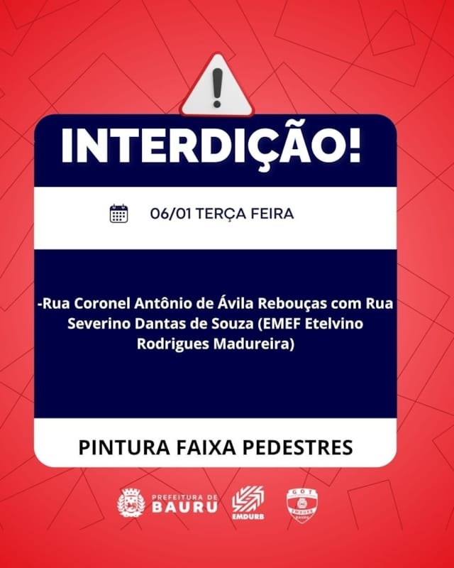 A Diretoria de Sistema Viário e Transportes da EMDURB, por meio do GOT, informa a seguinte interdição:-Cruzamento da rua Coronel Antônio de Ávila Rebouças com Severino Dantas de Souza, a partir das 7h30, para pintura de faixas de pedestres. O local estará sinalizado pelo GOT – Grupo de Operações de Trânsito. A EMDURB pede atenção aos motoristas.Acesse o link e participe da comunidade GOT e receba as interdições.https://chat.whatsapp.com/H9DZAyZCfXf3ata4FZ2gyqComunicação – EMDURB