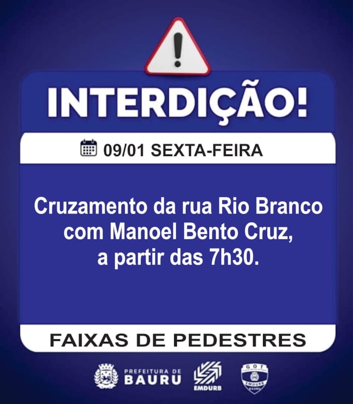 A Diretoria de Sistema Viário e Transportes da EMDURB, por meio do GOT, informa a seguinte interdição:-Cruzamento da rua Rio Branco com Manoel Bento Cruz, a partir das 7h30, para pintura de faixas de pedestres. O local estará sinalizado pelo GOT – Grupo de Operações de Trânsito. A EMDURB pede atenção aos motoristas.Acesse o link e participe da comunidade GOT e receba as interdições.https://chat.whatsapp.com/H9DZAyZCfXf3ata4FZ2gyqComunicação – EMDURB