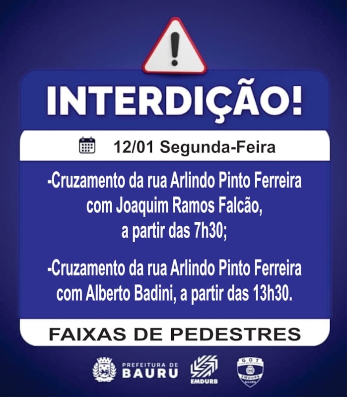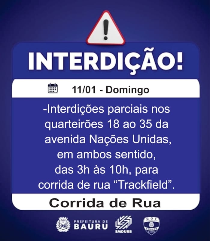 A Diretoria de Sistema Viário e Transportes da EMDURB, por meio do GOT, informa as seguintes interdições:SÁBADO (10):-Quarteirão 02 da rua Maria José Silvério dos Santos, das 9h às 12h, para evento social esportivo;-Quarteirão 05 da rua Militino Martins, das 7h às 14h, para evento religioso;-Quarteirão 18 da rua Nicolau Delgallo, a partir das 17h, para aniversário de bloco carnavalesco.DOMINGO (11):Corrida de rua:-Interdições parciais nos quarteirões 18 ao 35 da avenida Nações Unidas, em ambos sentido, das 3h às 10h, para corrida de rua “Trackfield”.SEGUNDA-FEIRA (12):-Cruzamento da rua Arlindo Pinto Ferreira com Joaquim Ramos Falcão, a partir das 7h30, para pintura de faixas de pedestres;-Cruzamento da rua Arlindo Pinto Ferreira com Alberto Badini, a partir das 13h30, para pintura de faixas de pedestres. Os locais estarão sinalizados pelo GOT – Grupo de Operações de Trânsito. A EMDURB pede atenção aos motoristas.Acesse o link e participe da comunidade GOT e receba as interdições.https://chat.whatsapp.com/H9DZAyZCfXf3ata4FZ2gyqComunicação – EMDURB