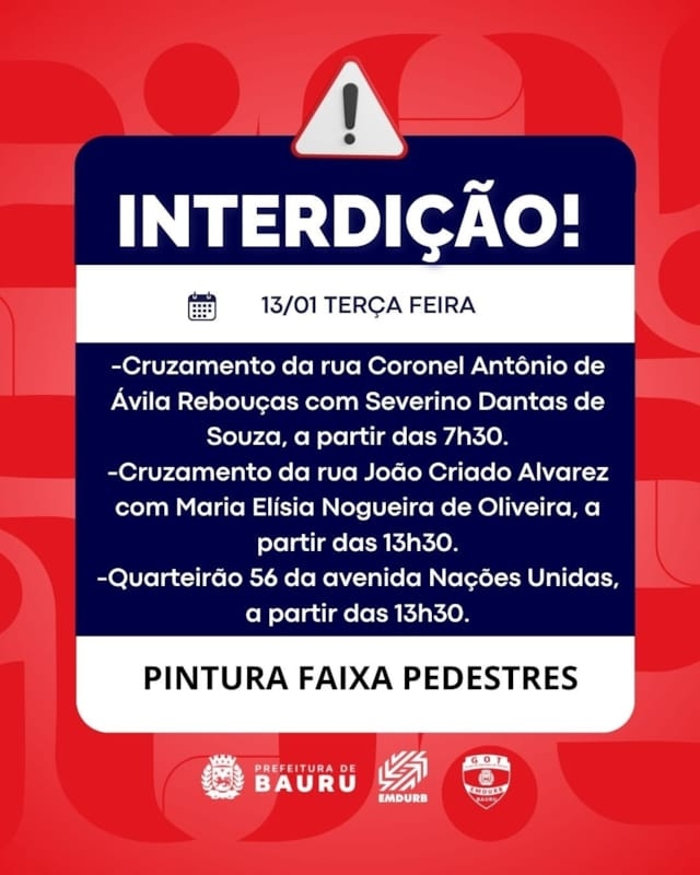 A Diretoria de Sistema Viário e Transportes da EMDURB, por meio do GOT, informa as seguintes interdições:-Cruzamento da rua Coronel Antônio de Ávila Rebouças com Severino Dantas de Souza, a partir das 7h30, para pintura de faixas de pedestres;-Cruzamento da rua João Criado Alvarez com Maria Elísia Nogueira de Oliveira, a partir das 13h30, para pintura de faixas de pedestres;-Quarteirão 56 da avenida Nações Unidas, a partir das 13h30, para pintura de faixas de pedestres. Os locais estarão sinalizados pelo GOT – Grupo de Operações de Trânsito. A EMDURB pede atenção aos motoristas.Acesse o link e participe da comunidade GOT e receba as interdições.https://chat.whatsapp.com/H9DZAyZCfXf3ata4FZ2gyqComunicação – EMDURB