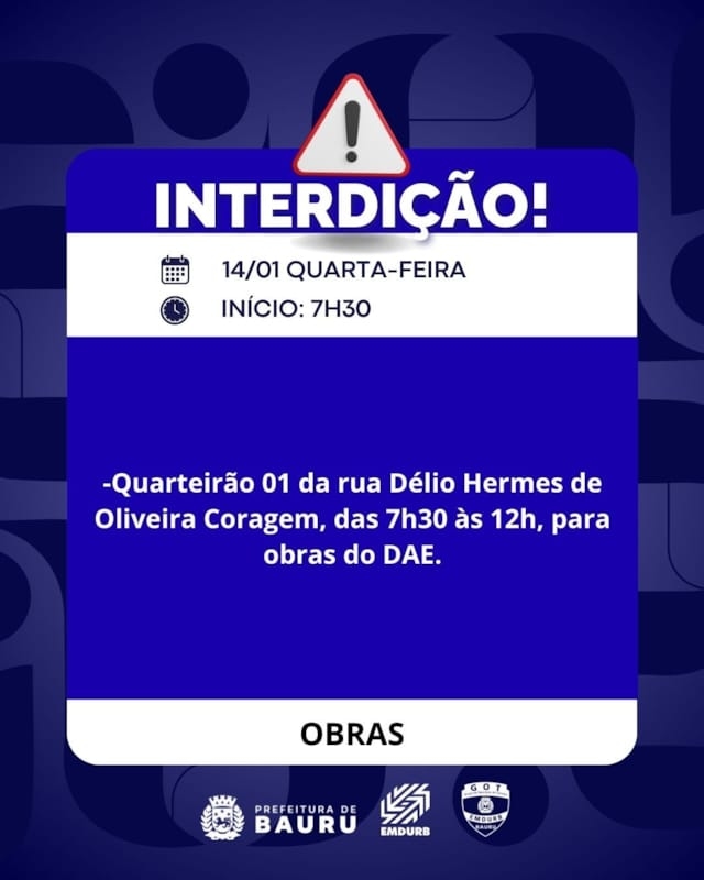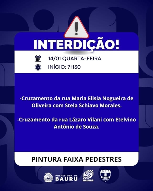 A Diretoria de Sistema Viário e Transportes da EMDURB, por meio do GOT, informa as seguintes interdições:-Quarteirão 01 da rua Délio Hermes de Oliveira Coragem, das 7h30 às 12h, para obras do DAE;-Cruzamento da rua Maria Elisia Nogueira de Oliveira com Stela Schiavo Morales, a partir das 7h30, para pintura de faixas de pedestres;-Cruzamento da rua Lázaro Vilani com Etelvino Antônio de Souza, a partir das 7h30, para pintura de faixas de pedestres. Os locais estarão sinalizados pelo GOT – Grupo de Operações de Trânsito. A EMDURB pede atenção aos motoristas.Acesse o link e participe da comunidade GOT e receba as interdições.https://chat.whatsapp.com/H9DZAyZCfXf3ata4FZ2gyqComunicação – EMDURB