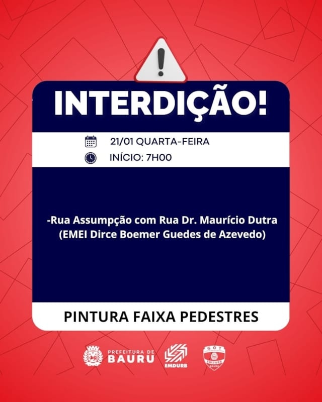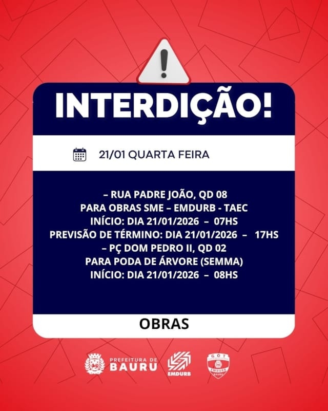 Bauru, 20 de janeiro de 2026EMDURB informa interdições programadas para quarta-feira (21) A Diretoria de Sistema Viário e Transportes da EMDURB, por meio do GOT, informa as seguintes interdições:–RUA PADRE JOÃO, QD 08PARA OBRAS SME – EMDURB - TAECINÍCIO: DIA 21/01/2026 – 07HSPREVISÃO DE TÉRMINO: DIA 21/01/2026 – 17HS– PÇ DOM PEDRO II, QD 02PARA PODA DE ÁRVORE (SEMMA)INÍCIO: DIA 21/01/2026 – 08HS-Rua Assumpção com Rua Dr. Maurício Dutra (EMEI Dirce Boemer Guedes de Azevedo) a partir das 7h30, para pintura de faixas de pedestres. Os locais estarão sinalizados pelo GOT – Grupo de Operações de Trânsito. A EMDURB pede atenção aos motoristas.Acesse o link e participe da comunidade GOT e receba as interdições.https://chat.whatsapp.com/H9DZAyZCfXf3ata4FZ2gyqComunicação – EMDURB