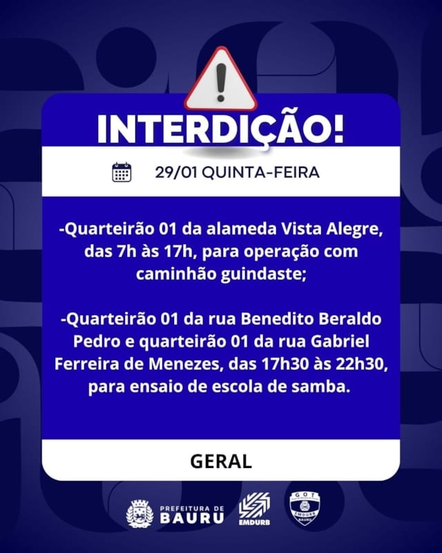 A Diretoria de Sistema Viário e Transportes da EMDURB, por meio do GOT, informa as seguintes interdições para quinta-feira (29):