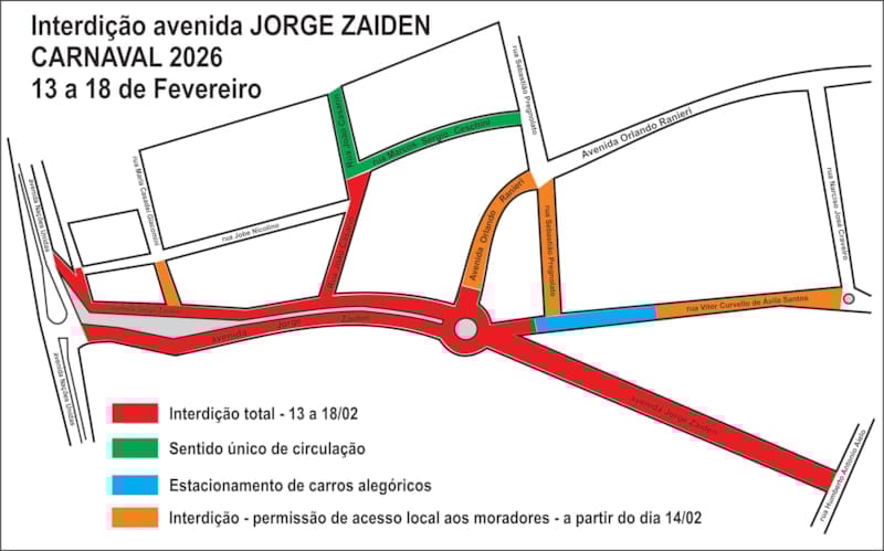 -Interdição TOTAL da avenida JORGE ZAIDEN, em ambos sentidos, a partir das 07h do dia 13/02 até o dia 18/02, para o desfile de Carnaval.