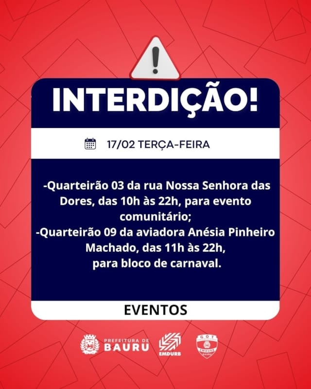 A Diretoria de Sistema Viário e Transportes da EMDURB, por meio do GOT, informa as seguintes interdições para terça-feira (17):-Quarteirão 03 da rua Nossa Senhora das Dores, das 10h às 22h, para evento comunitário;-Quarteirão 09 da aviadora Anésia Pinheiro Machado, das 11h às 22h, para bloco de carnaval. Os locais estarão sinalizados pelo GOT – Grupo de Operações de Trânsito. A EMDURB pede atenção aos motoristas.Acesse o link e participe da comunidade GOT e receba as interdições.https://chat.whatsapp.com/H9DZAyZCfXf3ata4FZ2gyqComunicação – EMDURB
