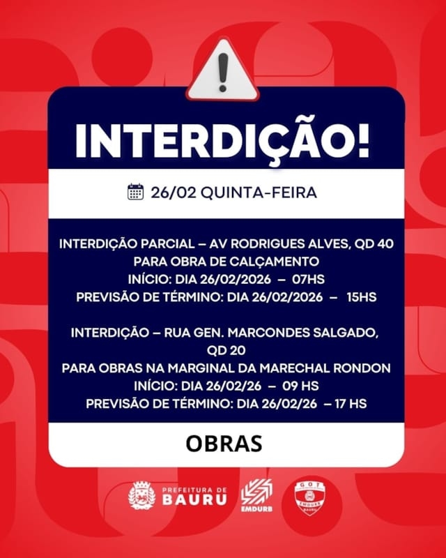 Bauru, 25 de fevereiro de 2026EMDURB informa interdições programadas para quinta-feira (26) A Diretoria de Sistema Viário e Transportes da EMDURB, por meio do GOT, informa as seguintes interdições para quinta-feira (26):INTERDIÇÃO PARCIAL – AV RODRIGUES ALVES, QD 40PARA OBRA DE CALÇAMENTOINÍCIO: DIA 26/02/2026 – 07HSPREVISÃO DE TÉRMINO: DIA 26/02/2026 – 15HSINTERDIÇÃO – RUA GEN. MARCONDES SALGADO, QD 20PARA OBRAS NA MARGINAL DA MARECHAL RONDONINÍCIO: DIA 26/02/26 – 09 HSPREVISÃO DE TÉRMINO: DIA 26/02/26 – 17 HS Os locais estarão sinalizados pelo GOT – Grupo de Operações de Trânsito. A EMDURB pede atenção aos motoristas.Acesse o link e participe da comunidade GOT e receba as interdições.https://chat.whatsapp.com/H9DZAyZCfXf3ata4FZ2gyqComunicação – EMDURB
