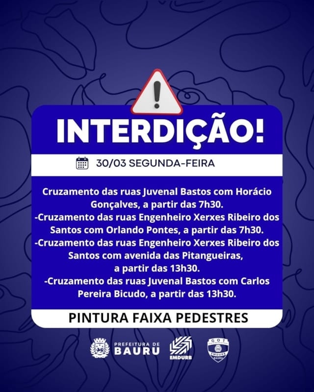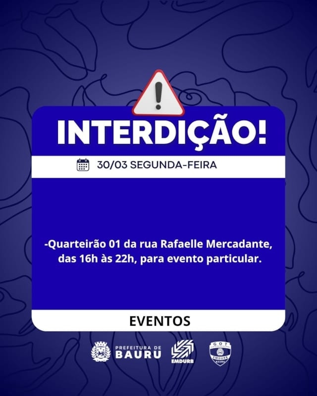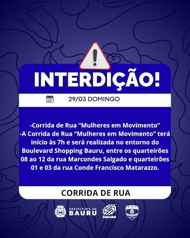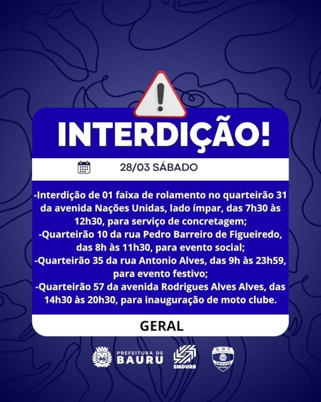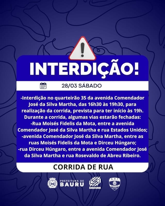 A Diretoria de Sistema Viário e Transportes da EMDURB, por meio do GOT, informa as seguintes interdições:SÁBADO (28):-Interdição de 01 faixa de rolamento no quarteirão 31 da avenida Nações Unidas, lado ímpar, das 7h30 às 12h30, para serviço de concretagem;-Quarteirão 10 da rua Pedro Barreiro de Figueiredo, das 8h às 11h30, para evento social;-Quarteirão 35 da rua Antonio Alves, das 9h às 23h59, para evento festivo;-Quarteirão 57 da avenida Rodrigues Alves, das 14h30 às 20h30, para inauguração de motoclube.Corrida de Rua “Feijuca dos Monges”:-Interdição no quarteirão 35 da avenida Comendador José da Silva Martha, das 16h30 às 19h30, para realização da corrida de rua “Feijuca dos Monges”, prevista para ter início às 19h.Durante a corrida, algumas vias estarão fechadas:-Rua Moisés Fidelis da Mota, entre a avenida Comendador José da Silva Martha e rua Estados Unidos;-Avenida Comendador José da Silva Martha, entre as ruas Moisés Fidelis da Mota e Dirceu Húngaro;-Rua Dirceu Húngaro, entre a avenida Comendador José da Silva Martha e rua Rosevaldo de Abreu Ribeiro.DOMINGO (29):Corrida de Rua “Mulheres em Movimento”:-A Corrida de Rua “Mulheres em Movimento” terá início às 7h e será realizada no entorno do Boulevard Shopping Bauru, entre os quarteirões 08 ao 12 da rua Marcondes Salgado e quarteirões 01 e 03 da rua Conde Francisco Matarazzo. Para tanto, alguns cruzamentos ficarão fechados a partir das 4h:-Cruzamento da rua Marcondes Salgado com as ruas Tamoios, Luis Bagnol, Caiapós, Tupiniquins e Alice Vieira Ranieri;-Cruzamento da rua Conde Francisco Matarazzo com as ruas Guarani e Tupinambá.SEGUNDA-FEIRA (30):-Quarteirão 01 da rua Rafaelle Mercadante, das 16h às 22h, para evento particular.-Cruzamento das ruas Juvenal Bastos com Horácio Gonçalves, a partir das 7h30, para pintura de faixa de pedestres;-Cruzamento das ruas Engenheiro Xerxes Ribeiro dos Santos com Orlando Pontes, a partir das 7h30, para pintura de faixa de pedestres;-Cruzamento das ruas Engenheiro Xerxes Ribeiro dos Santos com avenida das Pitangueiras, a partir das 13h30, para pintura de faixa de pedestres;-Cruzamento das ruas Juvenal Bastos com Carlos Pereira Bicudo, a partir das 13h30, para pintura de faixa de pedestres. Os locais estarão sinalizados pelo GOT – Grupo de Operações de Trânsito. A EMDURB pede atenção aos motoristas.Acesse o link e participe da comunidade GOT e receba as interdições.https://chat.whatsapp.com/H9DZAyZCfXf3ata4FZ2gyqComunicação – EMDURB