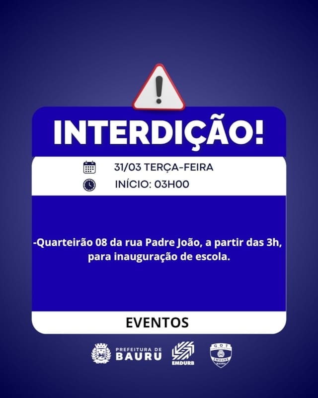 A Diretoria de Sistema Viário e Transportes da EMDURB, por meio do GOT, informa a seguinte interdição para terça-feira (31):-Quarteirão 08 da rua Padre João, a partir das 3h, para inauguração de escola. O local estará sinalizado pelo GOT – Grupo de Operações de Trânsito. A EMDURB pede atenção aos motoristas.Acesse o link e participe da comunidade GOT e receba as interdições.https://chat.whatsapp.com/H9DZAyZCfXf3ata4FZ2gyqComunicação – EMDURB