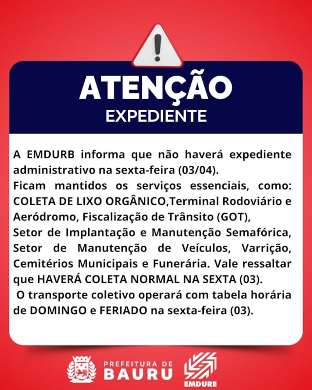 A EMDURB informa que não haverá expediente administrativo na sexta-feira (03/04). Ficam mantidos os serviços essenciais, como: COLETA DE LIXO ORGÂNICO, Terminal Rodoviário e Aeródromo, Fiscalização de Trânsito (GOT), Setor de Implantação e Manutenção Semafórica, Setor de Manutenção de Veículos, Varrição, Cemitérios Municipais e Funerária. Vale ressaltar que HAVERÁ COLETA NORMAL na sexta-feira (03).