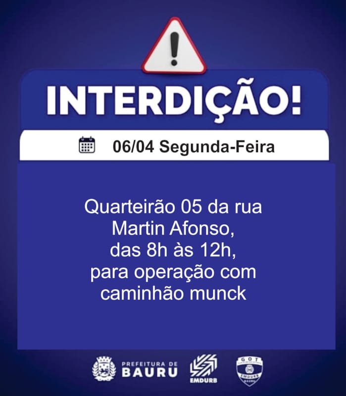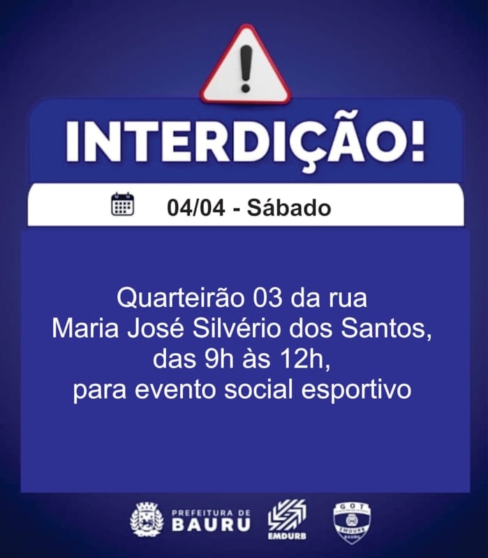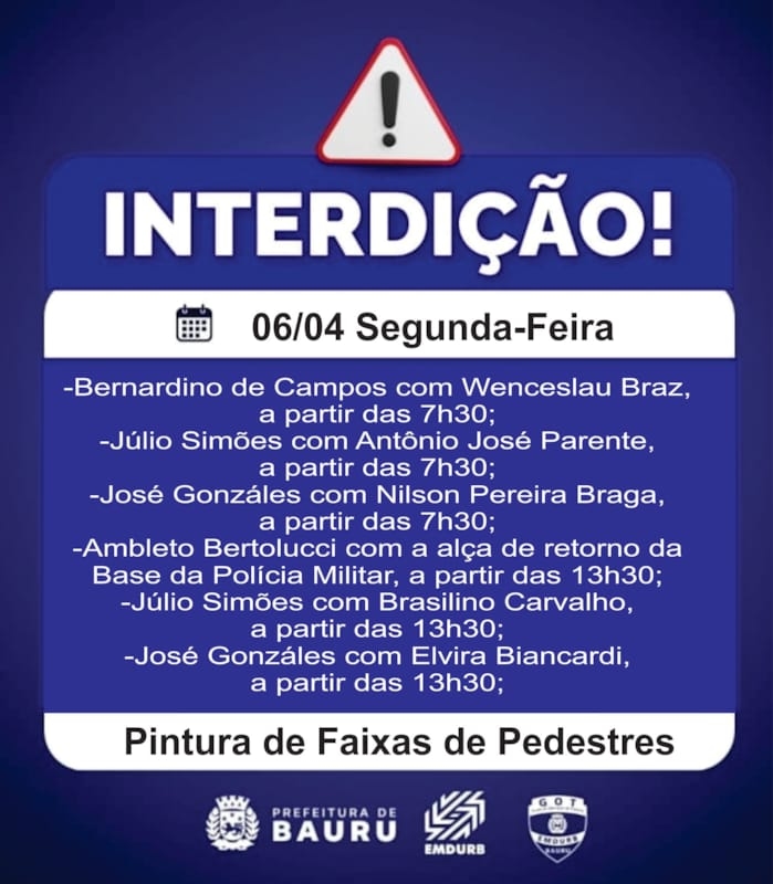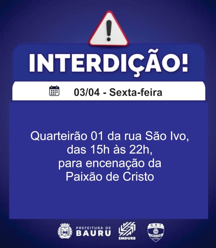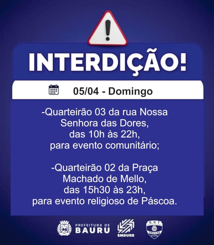 A Diretoria de Sistema Viário e Transportes da EMDURB, por meio do GOT, informa as seguintes interdições:SEXTA-FEIRA (03):-Quarteirão 01 da rua São Ivo, das 15h às 22h, para encenação da Paixão de Cristo;SÁBADO (04):-Quarteirão 03 da rua Maria José Silvério dos Santos, das 9h às 12h, para evento social esportivo.DOMINGO (05):-Quarteirão 03 da rua Nossa Senhora das Dores, das 10h às 22h, para evento comunitário;-Quarteirão 02 da Praça Machado de Mello, das 15h30 às 23h, para evento religioso de Páscoa.SEGUNDA-FEIRA (06):-Quarteirão 05 da rua Martin Afonso, das 8h às 12h, para operação com caminhão munck;-Cruzamento das ruas Bernardino de Campos com Wenceslau Braz, a partir das 7h30, para pintura de faixa de pedestres;-Cruzamento das ruas Júlio Simões com Antônio José Parente, a partir das 7h30, para pintura de faixa de pedestres;-Cruzamento das ruas José Gonzales com Nilson Pereira Braga, a partir das 7h30, para pintura de faixa de pedestres;-Cruzamento da avenida Ambleto Bertolucci com a alça de retorno da Base da Polícia Militar, a partir das 13h30, para pintura de faixa de pedestres;-Cruzamento das ruas Júlio Simões com Brasilino Carvalho, a partir das 13h30, para pintura de faixa de pedestres;-Cruzamento das ruas José Gonzáles com Elvira Biancardi , a partir das 13h30, para pintura de faixa de pedestres. Os locais estarão sinalizados pelo GOT – Grupo de Operações de Trânsito. A EMDURB pede atenção aos motoristas.Acesse o link e participe da comunidade GOT e receba as interdições.https://chat.whatsapp.com/H9DZAyZCfXf3ata4FZ2gyqComunicação – EMDURB