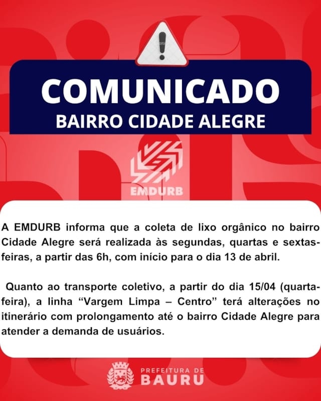 Coleta de Lixo Orgânico A EMDURB informa que a coleta de lixo orgânico no bairro Cidade Alegre será realizada às segundas, quartas e sextas-feiras, a partir das 6h, com início para o dia 13 de abril. Qualquer dúvida, o munícipe poderá entrar em contato pelos telefones 3233-9087, 3233-9080 e 3233-9053.Transporte Coletivo Quanto ao transporte coletivo, a partir do dia 15/04 (quarta-feira), a linha “Vargem Limpa – Centro” terá alterações no itinerário com prolongamento até o bairro Cidade Alegre para atender a demanda de usuários. Informações sobre horários e itinerários estão disponíveis no site da EMDURB https://www.emdurb.com.br/transpcoletivo Qualquer dúvida, entrar em contato pelo telefone 3321-4210.Comunicação – EMDURB