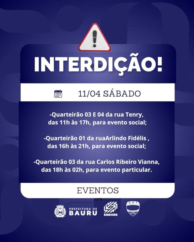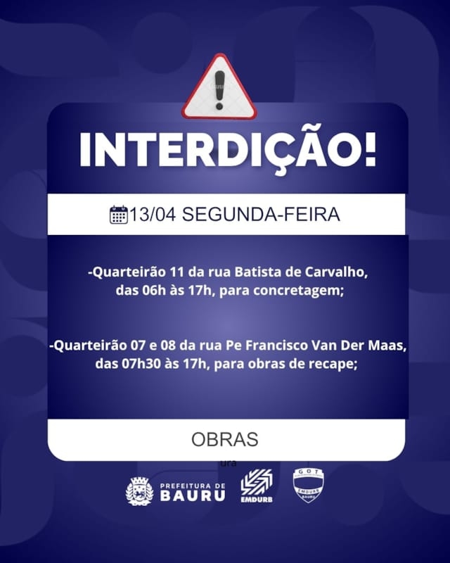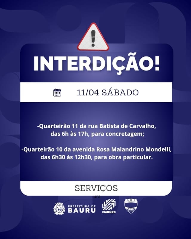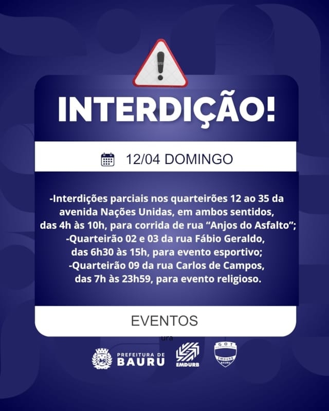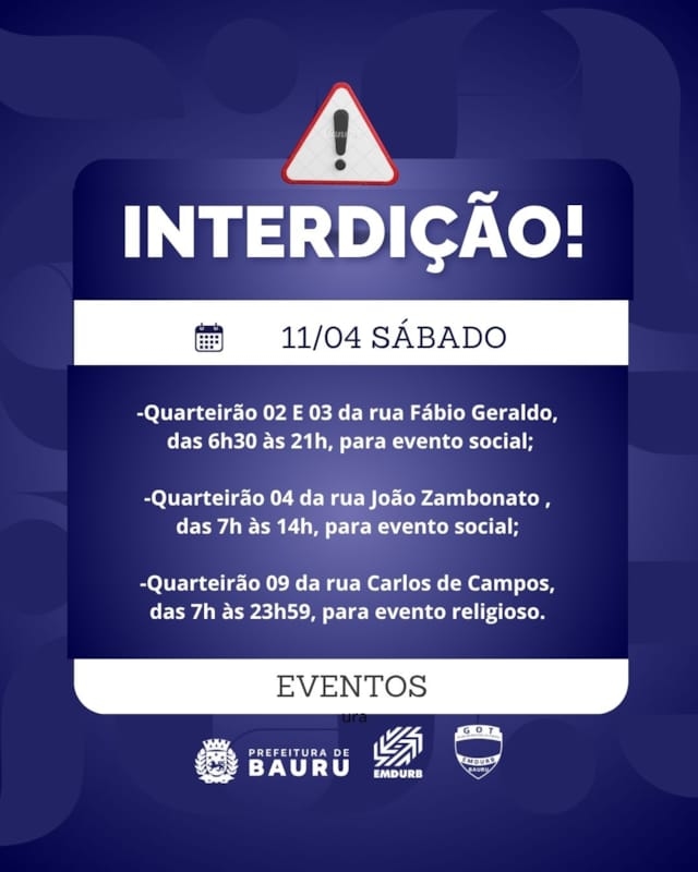 A Diretoria de Sistema Viário e Transportes da EMDURB, por meio do GOT, informa as seguintes interdições:EMDURB informa interdições programadas para o final de semanaSÁBADO (11):-Quarteirão 11 da rua Batista de Carvalho, das 6h às 17h, para concretagem;-Quarteirão 10 da avenida Rosa Malandrino Mondelli, das 6h30 às 12h30, para obra particular;-Quarteirão 02 e 03 da rua Fábio Geraldo, das 6h30 às 21h, para evento ABDA;-Quarteirão 04 da rua João Zambonato, das 7h às 14h, para evento social;-Quarteirão 09 da rua Carlos de Campos, das 7h às 23h59, para evento religioso;-Quarteirão 03 e 04 da rua Tenry, das 11h às 17h, para evento social;-Quarteirão 01 da rua Arlindo Fidélis, das 16h às 21h, para evento social;-Cruzamento das ruas Gabriel Ferreira de Menezes com Francisco Antônio Rodrigues, das 17h às 22h, para evento social;-Quarteirão 03 da rua Carlos Ribeiro Vianna, das 18h às 02h, para evento social;-Quarteirão 06,07 e 08 da rua Aparecida, das 18h30 às 22h, para evento social.DOMINGO (12):-Interdições parciais nos quarteirões 12 ao 35 da avenida Nações Unidas, em ambos sentido, das 4h às 10h, para corrida de rua “Anjos do Asfalto”;-Quarteirão 02 e 03 da rua Fábio Geraldo, das 6h30 às 15h, para evento esportivo;-Quarteirão 09 da rua Carlos de Campos, das 7h às 23h59, para evento religioso.SEGUNDA-FEIRA (13):-Quarteirão 11 da rua Batista de Carvalho, das 06h às 17h, para concretagem;-Quarteirão 07 e 08 da rua Pe Francisco Van Des Maas, das 07h30 às 17h, para obras de recape. Os locais estarão sinalizados pelo GOT – Grupo de Operações de Trânsito. A EMDURB pede atenção aos motoristas.Acesse o link e participe da comunidade GOT e receba as interdições.https://chat.whatsapp.com/H9DZAyZCfXf3ata4FZ2gyqComunicação – EMDURB