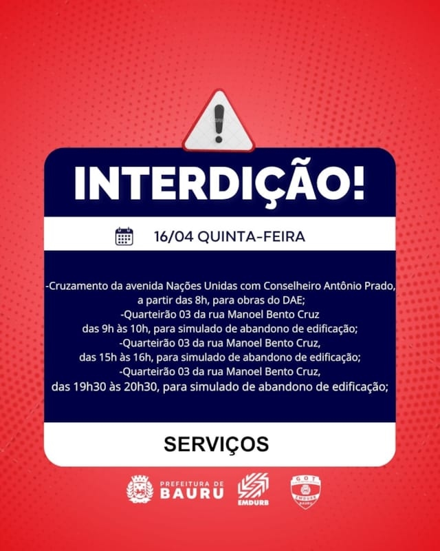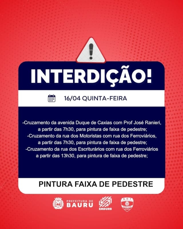 A Diretoria de Sistema Viário e Transportes da EMDURB, por meio do GOT, informa as seguintes interdições para quinta-feira (16):-Cruzamento da avenida Duque de Caxias com Professor José Ranieri, a partir das 7h30, para pintura de faixa de pedestre;-Cruzamento da rua dos Motoristas com rua dos Ferroviários, a partir das 7h30, para pintura de faixa de pedestre;-Cruzamento da rua dos Escriturários com rua dos Ferroviários, a, partir das 13h30, para pintura de faixa de pedestre;-Cruzamento da avenida Nações Unidas com Conselheiro Antônio Prado, a partir das 8h, para obras do DAE;-Quarteirão 03 da rua Manoel Bento Cruz,das 9h às 10h, para simulado de abandono de edificação;-Quarteirão 03 da rua Manoel Bento Cruz,das 15h às 16h, para simulado de abandono de edificação;-Quarteirão 03 da rua Manoel Bento Cruz,das 19h30 às 20h30, para simulado de abandono de edificação. Os locais estarão sinalizados pelo GOT – Grupo de Operações de Trânsito. A EMDURB pede atenção aos motoristas.Acesse o link e participe da comunidade GOT e receba as interdições.https://chat.whatsapp.com/H9DZAyZCfXf3ata4FZ2gyqComunicação – EMDURB