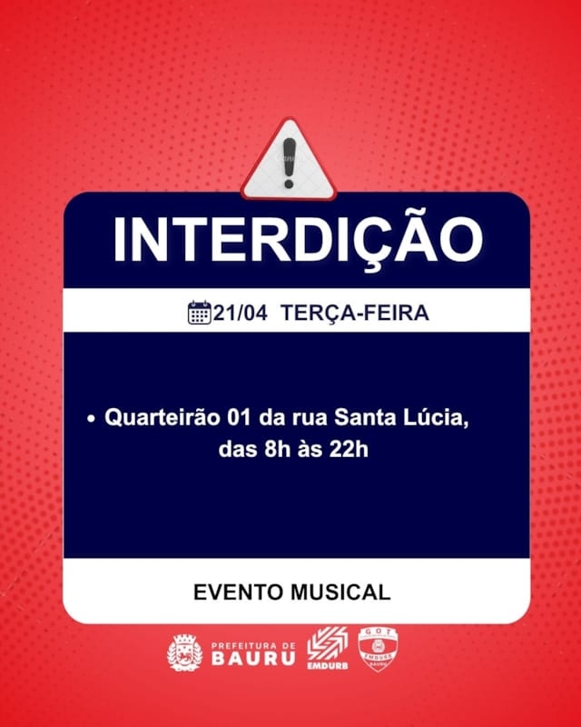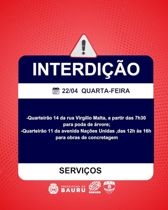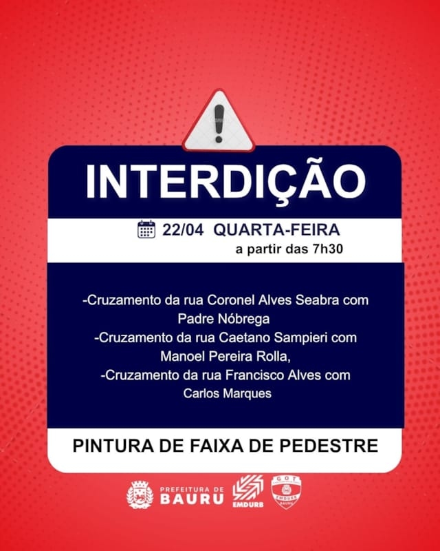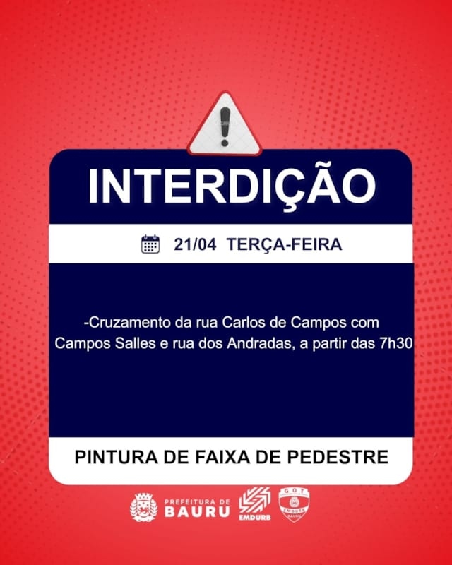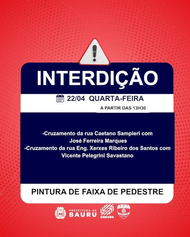 A Diretoria de Sistema Viário e Transportes da EMDURB, por meio do GOT, informa as seguintes interdições:TERÇA-FEIRA (21):-Cruzamento das ruas Carlos de Campos com Campos Salles e rua dos Andradas, a partir das 7h30, para pintura de faixa de pedestre;-Quarteirão 01 da rua Santa Lúcia, das 8h às 22h, para evento comunitário musical.QUARTA-FEIRA (22):-Cruzamento da rua Coronel Alves Seabra com Padre Nóbrega, a partir das 7h30, para pintura de faixa de pedestre;-Cruzamento da rua Caetano Sampieri com Manoel Pereira Rolla, a partir das 7h30, para pintura de faixa de pedestre; -Cruzamento da rua Francisco Alves com Carlos Marques, a partir das 7h30, para pintura de faixa de pedestre;-Quarteirão 14 da rua Virgílio Malta, a partir das 7h30, para poda de árvore;-Cruzamento da rua Caetano Sampieri com José Ferreira Marques, a partir das 13h30, para pintura de faixa de pedestre; -Cruzamento da rua Eng. Xerxes Ribeiro dos Santos com Vicente Pelegrini Savastano, a partir das 13h30, para pintura de faixa de pedestre;-Quarteirão 11 da avenida Nações Unidas, das 12h às 16h; para obras de concretagem. Os locais estarão sinalizados pelo GOT – Grupo de Operações de Trânsito. A EMDURB pede atenção aos motoristas.Acesse o link e participe da comunidade GOT e receba as interdições.https://chat.whatsapp.com/H9DZAyZCfXf3ata4FZ2gyqComunicação – EMDURB
