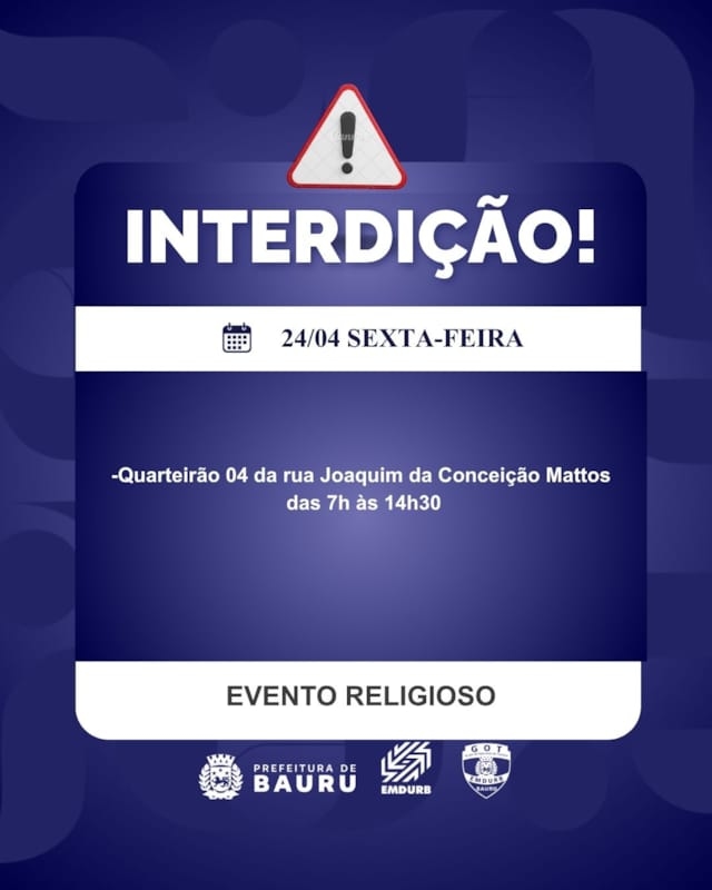 -Quarteirão 04 da rua Joaquim da Conceição Mattos, das 7h às 14h30, para evento religioso;