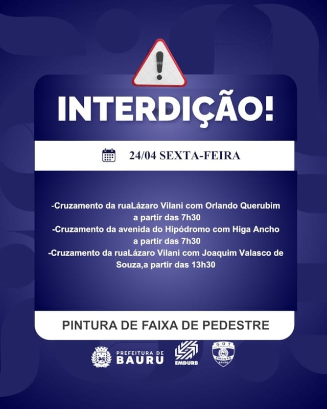 A Diretoria de Sistema Viário e Transportes da EMDURB, por meio do GOT, informa as seguintes interdições para sexta-feira (24):-Quarteirão 04 da rua Joaquim da Conceição Mattos, das 7h às 14h30, para evento religioso;-Cruzamento da rua Lázaro Vilani com Orlando Querubim, a partir das 7h30,para pintura de faixa de pedestre;-Cruzamento da avenida do Hipódromo com Higa Ancho, a partir das 7h30, para pintura de faixa de pedestre;-Cruzamento da rua Lázaro Vilani com Joaquim Valasco de Souza, a partir das 13h30, para pintura de faixa de pedestre. Os locais estarão sinalizados pelo GOT – Grupo de Operações de Trânsito. A EMDURB pede atenção aos motoristas.Acesse o link e participe da comunidade GOT e receba as interdições.https://chat.whatsapp.com/H9DZAyZCfXf3ata4FZ2gyqComunicação – EMDURB