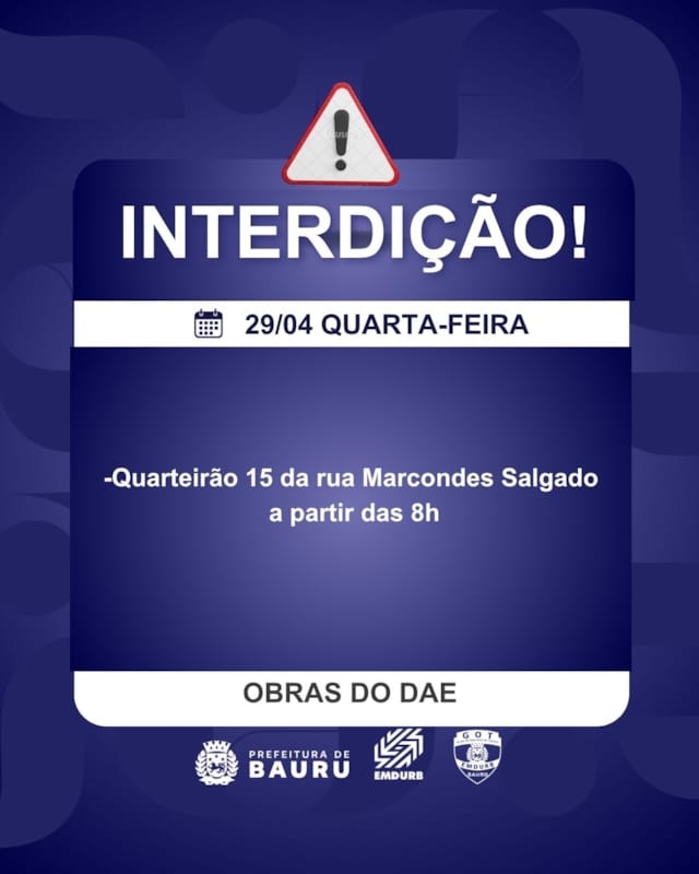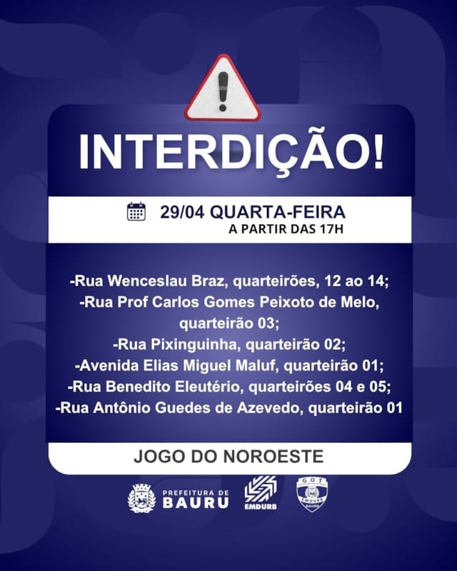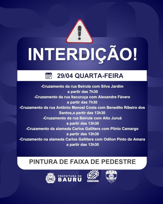A Diretoria de Sistema Viário e Transportes da EMDURB, por meio do GOT, informa as seguintes interdições para quarta-feira (29):-Cruzamento da rua Beirute com Silva Jardim, a partir das 7h30, para pintura de faixa de pedestre;-Cruzamento da rua Itacuruça com Alexandre Fávero, a partir das 7h30, para pintura de faixa de pedestre;-Quarteirão 15 da rua Marcondes Salgado, a partir das 8h, para obras do DAE;-Cruzamento da rua Antônio Manoel Costa com Benedito Ribeiro dos Santos, a partir das 13h30, para pintura de faixa de pedestre;-Cruzamento da rua Beirute com Alto Juruá, a partir das 13h30, para pintura de faixa de pedestre;-Cruzamento da alameda Carlos Galliters com Plínio Camargo, a partir das 13h30, para pintura de faixa de pedestre;-Cruzamento na alameda Carlos Galliters com Odilon Pinto do Amaral, a partir das 13h30, para pintura de faixa de pedestre.Interdições nas imediações do Estádio Alfredo de Castilho para Jogo do Noroeste, a partir das 17h:-Rua Wenceslau Braz, quarteirões, 12 ao 14;-Rua Professor Carlos Gomes Peixoto de Melo, quarteirão 03;-Rua Pixinguinha, quarteirão 02;-Avenida Elias Miguel Maluf, quarteirão 01;-Rua Benedito Eleutério, quarteirões 04 e 05;-Rua Antônio Guedes de Azevedo, quarteirão 01. Os locais estarão sinalizados pelo GOT – Grupo de Operações de Trânsito. A EMDURB pede atenção aos motoristas.Acesse o link e participe da comunidade GOT e receba as interdições.https://chat.whatsapp.com/H9DZAyZCfXf3ata4FZ2gyqComunicação – EMDURB