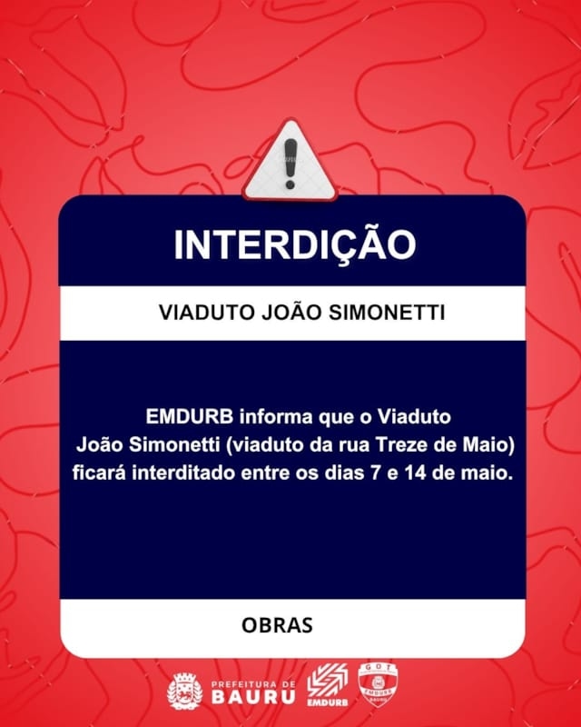 A pedido da Secretaria de Infraestrutura, a EMDURB informa que o Viaduto João Simonetti (viaduto da rua Treze de Maio) ficará interditado entre os dias 7 e 14 de maio.