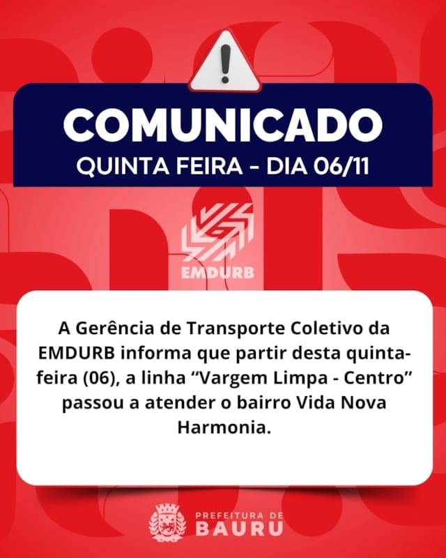 A Gerência de Transporte Coletivo da EMDURB informa que partir desta quinta-feira (06), a linha “Vargem Limpa - Centro” passou a atender o bairro Vida Nova Harmonia.